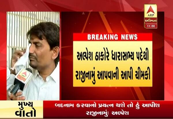 એબીપી અસ્મિતા સાથેની વાતચીતમાં અલ્પેશ ઠાકોરનું સૌથી મોટું નિવેદન આપ્યું હતું. કોંગ્રેસના ધારાસભ્ય અલ્પેશ ઠાકોરે જણાવ્યું હતું કે, તેણે ધારાસભ્ય પદેથી રાજીનામું આપવાની ચીમકી આપી છે. આ દરમિયાન અલ્પેશ ઠાકોર ભાવુક થઈ ગયો હતો અને રડવા લાગ્યો હતો.