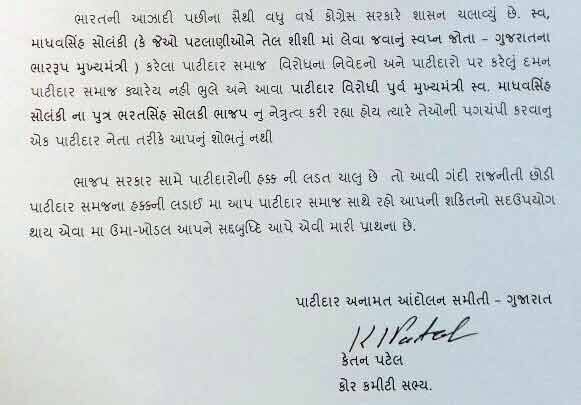 અમદાવાદઃ પાટીદાર અનામત આંદોલન સમિતિના બે કન્વીનરો કેતન પટેલ અને દિનેશ બાંભણીયા સામસામે આવી ગયા છે. કેતન પટેલે કોંગ્રેસના નેતા સિદ્ધાર્થ પટેલને પત્ર લખી આક્ષેપ કર્યો છે કે, સિદ્ધાર્થ પટેલ પાટીદાર આંદોલનને ઊંધા પાટે ચડાવવા મથે છે. એટલું જ નહીં, પણ દિનેશ બાંભણીયા તેમનો હાથો બની ટિકિટોના વેપારમાં સામેલ છે અને પૈસા ખાય છે. આ સંપૂર્ણ પત્ર અહીં પ્રસ્તુત છે.