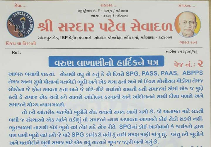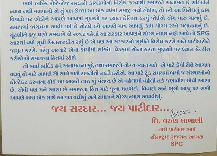 SPGના સૌરાષ્ટ્ર ઝોનના પ્રમુખે 'તોફાની પાટીદાર' હાર્દિકને પત્ર લખી શું કહ્યું? વાંચો પત્ર