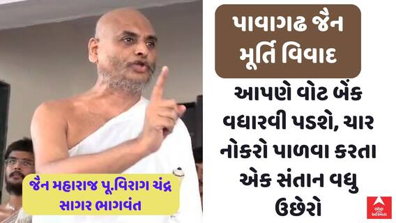 પાવાગઢ જૈન તિર્થંકરોની મૂર્તિ ખંડિત થવાના મામલો જૈન મહારાજ પૂ.વિરાગ ચંદ્ર સાગર ભાગવંતનું નિવેદન સામે આવ્યું છે. તેમણે કહ્યું, આપણે નોટ બેંક છીએ વોટ બેંક નથી, એટલે આપણે દર વખતે આજીજી કરવી પડે છે. આવતીકાલે આપણે વોટ બેંક વધારવી પડશે. આ આંદોલન આપણને પૂછે છે. ચાર નોકરો પાળવા કરતા એક સંતાન વધુ ઉછેરો. અહીંયા આપણે બેઠા છીએ એ એમની મજબૂરી છે,નહીંતર એ લોકો અપણને ધક્કો મારી ગેટ આઉટ કરી દેત.
