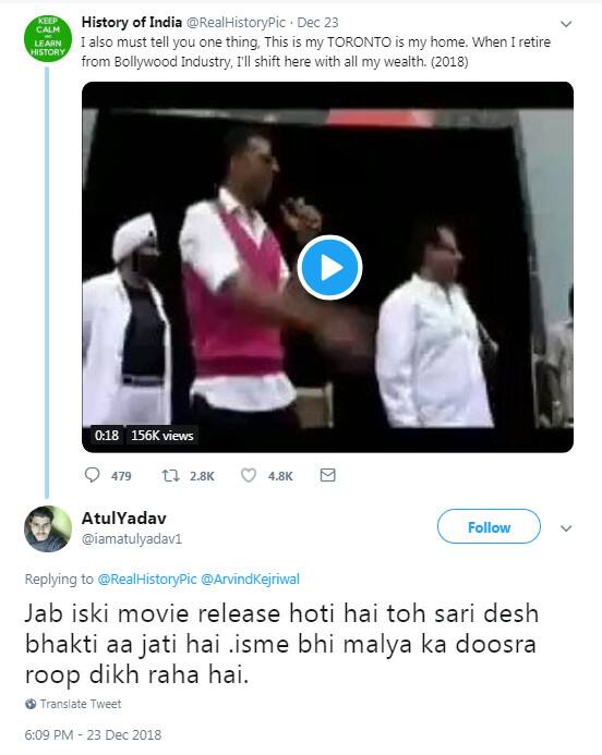 અક્ષયના આ નિવેદનને લઇનો લોકોએ સોશ્યલ મીડિયા પર જબરદસ્ત ટ્રૉલ કર્યો છે. ટ્વીટર યૂઝર્સ તેના પર દેશભક્તિનો જુઠ્ઠો દેખાડો કરવા અને દેશભક્તિ વેચીનને પૈસા કમાવવાનો આરોપ લગાવી રહ્યાં છે.