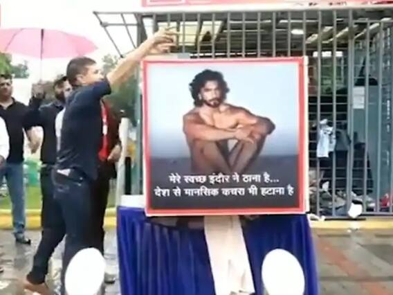 ઈન્દોરમાં કપડાંનું દાન કરાયુંઃરણવીર સિંહના ન્યુડ ફોટોશૂટના વિરોધમાં મુંબઈના ચેમ્બુરમાં ફરિયાદ નોંધાઈ છે. તો બીજી તરફ મધ્યપ્રદેશના ઈન્દોરમાં રણવીર સામે અનોખું વિરોધ-પ્રદર્શન પણ થઈ રહ્યું છે. રણવીર માટે લોકોએ કપડાં ભેગાં કર્યાં હતું અને માનસિક કચરો સાફ કરરવાનો સંકલ્પ લીધો છે. આ કપડાં દાન કરવાનો વીડિયો પણ સામે આવ્યો છે. વીડિયોમાં જોઈ શકાય છે કે, એક બોક્સમાં રણવીર સિંહના ન્યુડ ફોટોશૂટમાંનો એક ફોટો લગાવાયો છે અને લોકો એ બોક્સમાં કપડાં મુકી રહ્યા છે. રણવીરના ફોટો પર 'मेरे स्वच्छ इंदौर ने ठाना है, देश से मानसिक कचरा भी हटाना है.' લખવામાં આવ્યું છે.