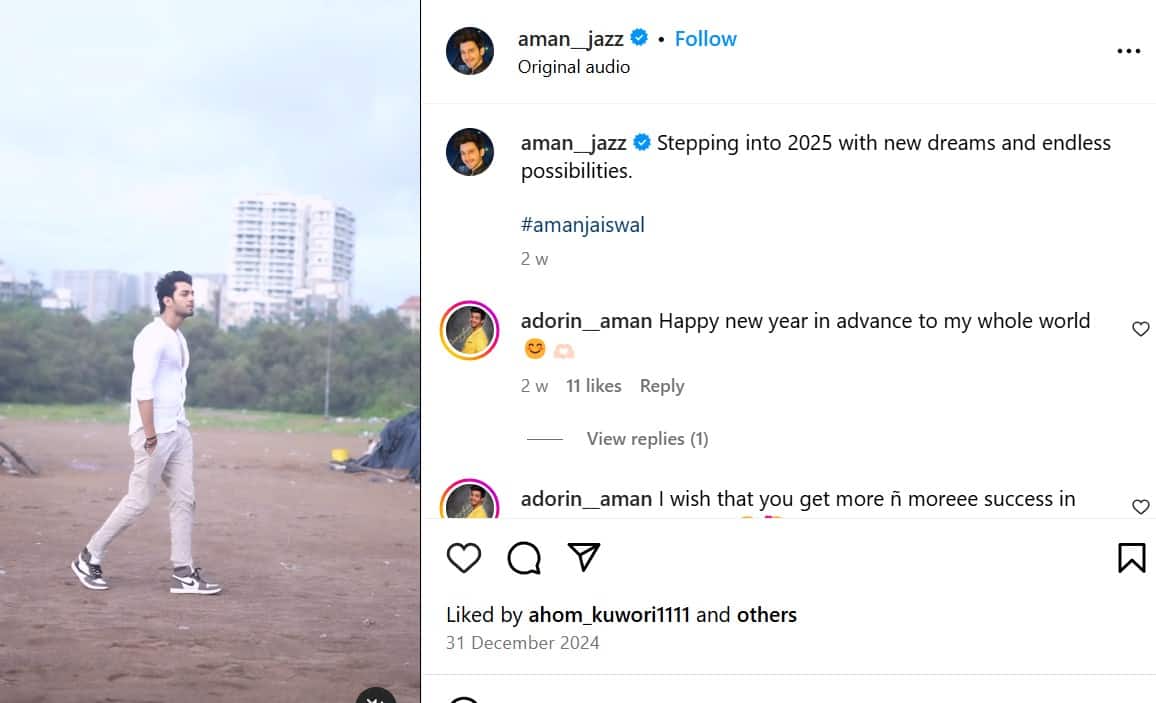 અમન જયસ્વાલના તેના ઇન્સ્ટાગ્રામ હેન્ડલ પર 65.7 હજાર ફોલોઅર્સ છે. તે તેના સોશિયલ મીડિયા હેન્ડલ્સ દ્વારા તેના ચાહકો સાથે જોડાયેલ રહે છે. તેણે નવા વર્ષમાં એક વીડિયો પોસ્ટ કરીને વર્ષ 2025 વિશેના પોતાના વિચારો પણ તેના ચાહકો સાથે શેર કર્યા હતા.