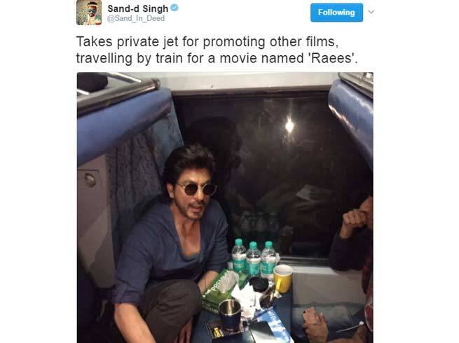 શાહરૂખ ખાન પોતાની ફિલ્મ રઈસના પ્રમોશન માટે મુંબઈથી દિલ્લી ટ્રેનમાં મુસાફરી કરી રહ્યા છે. જો કે ટ્વિટર પર આ મુદ્દાને લઈને મજાક થઈ રહી છે. જુઓ કેટલાક ટ્વિટ