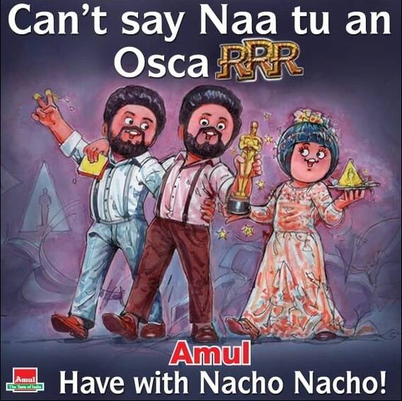 ફિલ્મ 'RRR'ના ગીત Naatu - Naatu એ જાન્યુઆરીમાં ગોલ્ડન ગ્લોબ એવોર્ડ પણ જીત્યો હતો અને હવે ઓસ્કારમાં આ ગીતની જીતે તેની લોકપ્રિયતા સાબિત કરી બતાવી છે. અમૂલ દ્વારા શેર કરવામાં આવેલા આ ડૂડલમાં તેણે રામ ચરણ અને જુનિયર એનટીઆર સાથે અમૂલ ગર્લનું કેરિકેચર બનાવ્યું છે. તે આ ગીતના સિગ્નેચર ગેટઅપમાં હતો અને તેના હાથમાં ઓસ્કાર ટ્રોફી પકડેલી જોવા મળે છે. જ્યારે અમૂલ યુવતી હાથમાં માખણની થાળી પકડીને જોવા મળે છે. આ ડૂડલ સાથે લખવામાં આવ્યું છે કે, "Oscar RRRને ના કહી શકાય". "હેવ વિથ નાચો નાચો અમૂલ" (કાન્ટ સે ના તુ એન ઓસ્કાર આરઆરઆર) (Have With Nacho Nacho! Amul). નાટુ-નાટુની સફળતા પર ખુશી વ્યક્ત કરતા અમૂલે માત્ર ડૂડલ જ નહોતુ બનાવ્યું પરંતુ ટૂંકી દસ્તાવેજી ફિલ્મ 'ધ એલિફન્ટ વ્હીસ્પરર્સ'ની જીત પર પણ આવું જ ડૂડલ શેર કર્યું છે. જેમાં ફિલ્મના નિર્માતા ગુનીત મોંગા અને કાર્તિકી ગોન્સાલ્વિસના સ્કેચ છે, જેમાં તે હાથમાં ટ્રોફી પકડેલી જોવા મળે છે. તેમની સાથે એક હાથી અને અમૂલ છોકરી હાથીના કાનમાં કંઈક બોલી રહી છે. આ ડૂડલ સાથે લખ્યું હતું, 'હાથી મેરે સાથી! અને અમૂલ જમ્બો ટેસ્ટ!.