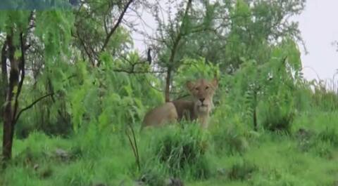 કહેવાય છે કે ચોમાસાના ઋતુમાં સાવજો પોતાનું રહેઠાણ ઉંચા ટેકરા પર બનાવી લેતા હોય છે. પરંતુ આવા દ્રશ્યો જોવા દુર્લભ હોય છે. આ દ્રશ્યો ખાંભા તાલુકાના કોળિયા ગામની સીમના છે. લાખાભાઇ વાળા નામના ખેડૂતની વાડીમાં આ સિંહણ પોતાના બે બચ્ચા સાથે સુરક્ષિત ટેકરા પર બેઠી હોય તેવા દ્રશ્યો જોવા મળ્યા હતા.