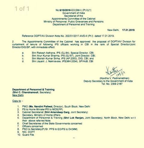 રાકેશ અસ્થાનાની સિવિલ એવિએશન સિક્યોરિટી બ્યુરોમાં બદલી કરવામાં આવી છે. અરુણકુમાર શર્માને CRPFના એડિશનલ ડીજી બનાવવામાં આવ્યા છે.