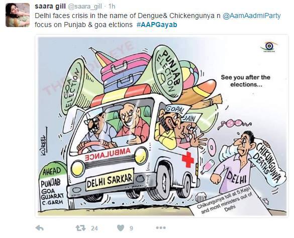 દિલ્હીમાં ચિકનગુનિયા અને ડેન્ગ્યુ સતત ફેલાઈ રહ્યો છે. એવામાં કોંગ્રેસ તરફથી 16 સપ્ટેમ્બર 2016ને 'ભગોડા દિવસ' મનાવી રહ્યું છે. તેના માટે ટ્વિટ પર #AAPGayab ટ્રેન્ડ કરી રહ્યું છે. તેના પર લોકો આમ આદમી પાર્ટી, કેજરીવાલ, સિસોદિયા સહિત આપના અન્ય નેતા વિરૂદ્ધ કાર્ટૂન પોસ્ટ કરી રહ્યા છે. જુઓ કેવા કેવા કાર્ટૂન પોસ્ટ કરવામાં આવી રહ્યા છે.