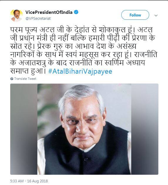 રાહુલ ગાંધીએ ટ્વિટ કરી કહ્યું, "ભારતે આજે એક મહાન પૂત્રને ગુમાવ્યો, પૂર્વ વડાપ્રધાન અટલ બિહારી વાજપેયીજી હજારો લોકો પ્રેમ અને આદર કરતા હતા. અને તેમને યાદ કરીશું "