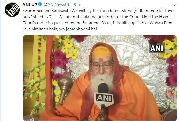 નવી દિલ્હીઃ દ્વારકા શારદાપીઠના શંકરાચાર્ય સ્વામી સ્વરૂપાનંદ સરસ્વતીએ રામ મંદિર મુદ્દે મોટું નિવેદન આપ્યું છે. તેમણે કહ્યું કે, 21 ફેબ્રુઆરીએ રામમંદિરના નિર્માણ માટે પહેલી ઈંટ મુકાશે. આ કામ માટે તમામ સાધુ સંતોએ ગોળી ખાવા માટેની પણ તૈયારી દર્શાવી છે.