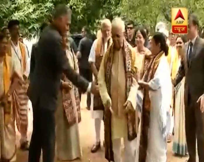 વળી, બીજી ઘટના શાંતિ નિકેતનમાં ઘટી, અહીં પીએમ નરેન્દ્ર મોદી, રાજ્યપાલન કેસરીનાથ ત્રિપાઠી અને સીએણ મમતા બેનર્જી ફોટો સેશનમાં પહોંચ્યા. આ દરમિયાન ગવર્નર કેસરીનાથ ત્રિપાઠી વારંવાર પીએમ મોદીની આગળ જઇ રહ્યાં હતા. ત્યારે સીએમ મમતા બેનર્જીએ લગભગ ધક્કો મારતા પીએમ મોદીની આગળથી ગવર્નરને હટાવી દીધા, જોકે સીએમ મમતા બેનર્જીના હાવભાવથી એવું લાગ્યું કે તેમને મજાકીયા અંદાજમાં આમ કર્યું હતું. તેમના ચહેરા પર હાસ્ય સ્પષ્ટ દેખાતું હતું.