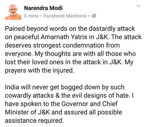 આ ઘટનાને કડક શબ્દોમાં નિંદા કરતાં વડાપ્રધાન નરેન્દ્ર મોદીએ જણાવ્યું હતું કે, આવા કાયરતાભર્યા હુમલાથી ભારત ક્યારેય ઝૂકશે નહીં. નરેન્દ્ર મોદીએ ટ્વિટ કરતાં લખ્યું, જમ્મુ-કાશ્મીરમાં અમરનાથ યાત્રાળુઓ પર થયેલા કાયરતાભર્યા હુમલાનો દુ:ખ શબ્દોમાં વર્ણવી ન શકાય. દરેકે આ હુમલાની કડક નિંદા કરવી જોઇએ.
