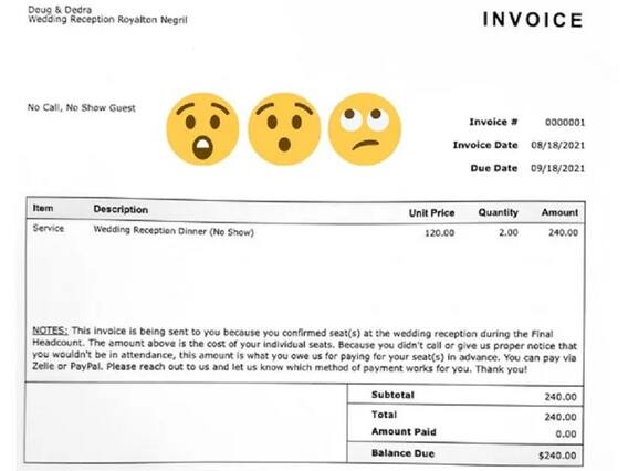 ઇનવોઇસના નોટ્સમાં લખ્યું છે કે, "આ ઇન્વોઇસ તમને મોકલવામાં આવી રહ્યું છે કારણ કે તમે અંતિમ હેડકાઉન્ટ દરમિયાન લગ્નના રિસેપ્શનમાં બેઠકોની પુષ્ટિ કરી હતી. ઉપરની રકમ તમારી વ્યક્તિગત બેઠકોની કિંમત છે. કારણ કે તમે ફોન કર્યો ન હતો અથવા અમને યોગ્ય સૂચના આપી ન હતી કે તમે હાજર નથી રહેવાના. આ રકમ એ છે કે તમારી સીટ (જગ્યાઓ) માટે અગાઉથી પેમેન્ટ કરવામાં આવ્યું હતું જે તમારા પર અમારા બાકી છે. "
