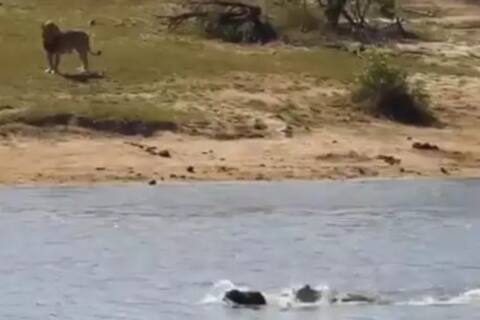 વીડિયોમાં દેખાઇ રહ્યું છે કે, એક સિંહ શિકાર કરવા માટે એક ભેંસની પાછળ દોડે છે. ભેંસ પોતાનો જીવ બચાવવા ભાગી રહી છે, બાદમાં તે નદીમાં કુદી પડે છે, અહીં ભેંસ પર મગરમચ્છ હુમલો કરી દે છે. જોકે, બાદમાં ભેંસ સહીસલામત બચી નીકળે છે