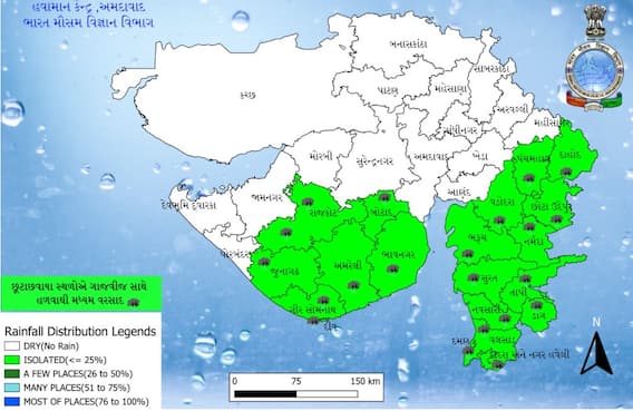 હવામાન વિભાગના જણાવ્યા મુજબ, આજે દાહોદ, છોટાઉદેપુર, નર્મદા, તાપી, ડાંગ, સુરત, નવસારી, વલસાડ, દમણ અને દાદરાનગર હવેલીમાં વરસાદની આગાહી કરવામાં આવી છે. આ સિવાય રાજકોટ, અમરેલી, ભાવનગર, ગીર સોમનાથ, બોટાદ, જૂનાગઢ, પોરબંદરમાં વરસાદની આગાહી કરવામાં આવી છે.