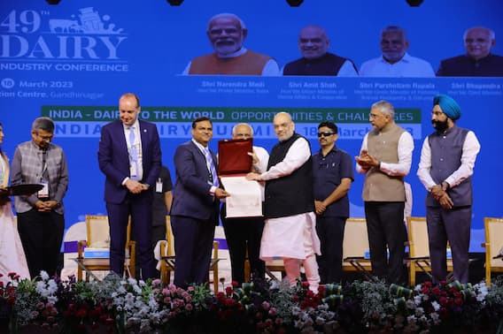 Gandhinagar: કેન્દ્રીય ગૃહ અને સહકાર મંત્રી અમિત શાહે 18 માર્ચ, 2023ના રોજ ગાંધીનગરમાં યોજાયેલી 49મી ડેરી ઇન્ડસ્ટ્રી કૉન્ફરન્સ દરમિયાન નેશનલ ડેરી ડેવલપમેન્ટ બૉર્ડ (એનડીડીબી)ના ચેરમેન મીનેશ શાહને 14મો ડૉ. કુરિયન એવોર્ડ એનાયત કર્યો હતો. આ પ્રસંગે ગુજરાતના મુખ્યમંત્રી ભૂપેન્દ્રભાઈ પટેલ, ગુજરાત સરકારના સહકાર મંત્રી જગદીશ વિશ્વકર્મા, ભારત સરકારના પશુપાલન અને ડેરીઉદ્યોગ વિભાગના સચિવ રાજેશકુમાર સિંહ, જીસીએમએમએફ લિ.ના ચેરમેન શામળભાઈ પટેલ, ઇન્ડિયન ડેરી એસોસિયેશનના અધ્યક્ષ ડૉ. આર. એસ. સોઢી, ઇન્ટરનેશનલ ડેરી ફેડરેશન (આઇડીએફ)ના અધ્યક્ષ પીયરક્રિસ્ટિયાનો બ્રેઝાલે તથા આઇડીએફના ડિરેક્ટર જનરલ કેરોલિન એમોન્ડ હાજર રહ્યાં હતાં.