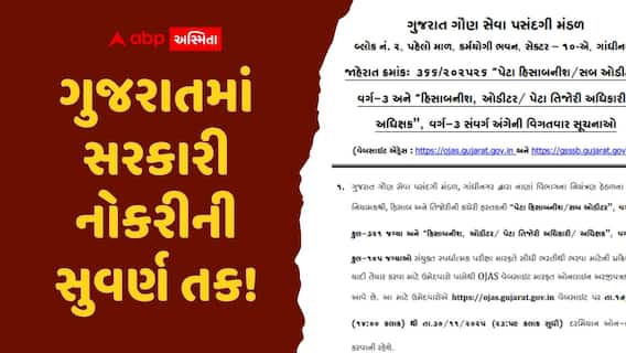 GSSSB Recruitment 2025: ગુજરાત ગૌણ સેવા પસંદગી મંડળ (GSSSB) દ્વારા 2025 ની મોટી ભરતીની જાહેરાત કરવામાં આવી છે. નાણાં વિભાગ હસ્તકની કચેરીઓ માટે કુલ 426 જગ્યાઓ પર આ ભરતી પ્રક્રિયા હાથ ધરાશે. જેમાં સબ ઓડિટર, પેટા હિસાબનીશ અને પેટા તિજોરી અધિકારી/અધિક્ષક જેવી વર્ગ-3 ની પ્રતિષ્ઠિત પોસ્ટનો સમાવેશ થાય છે. આ ભરતી માટેની ઓનલાઈન અરજી પ્રક્રિયા આવતીકાલે, 17 નવેમ્બર, 2025 (બપોરે 2 વાગ્યાથી) ojas.gujarat.gov.in પોર્ટલ પર શરૂ થશે.