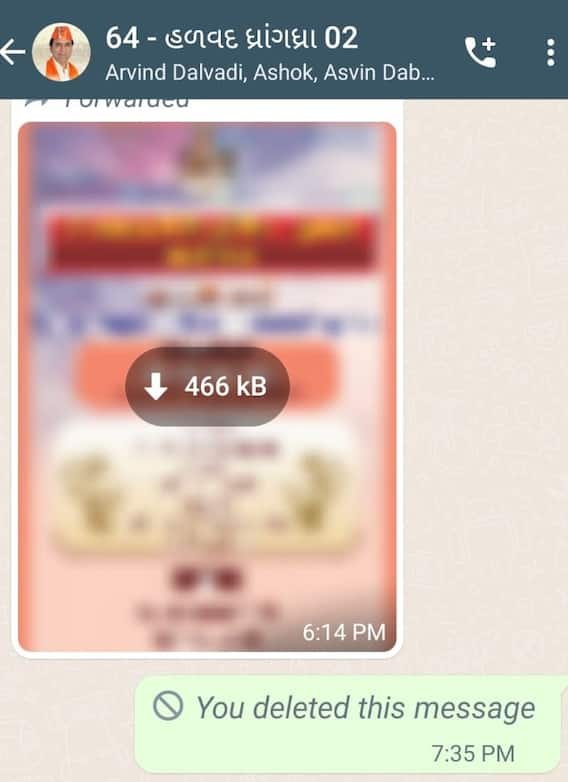 હળવદના ધ્રાંગધ્રા વિધાનસભાના વોટ્સએપ ગ્રુપમાં બિભત્સ ફોટાનો સ્ક્રીનશોટ હાલ વાયરલ થયો છે. હળવદ- ધ્રાંગધ્રાના ધારાસભ્ય પ્રકાશ વરમોરાના ડીપી વાળા આ વોટ્સગ્રુપમાં બિભત્સ ફોટાનો સ્ક્રીનશોટ વાયરલ થયો છે. આ ગ્રુપ ચૂંટણી સમયે પ્રચાર પ્રસાર માટે બનાવવામાં આવ્યું હતું. આ ગ્રુપમાં ભાજપના નેતાઓ પણ જોડાયેલા છે. ગ્રુપમાં બિભત્સ ફોટાનો સ્ક્રીનશોટ વાયરલ થતા હાલ તો ભાજપના કોઈ નેતા કંઈ બોલવા તૈયાર નથી.