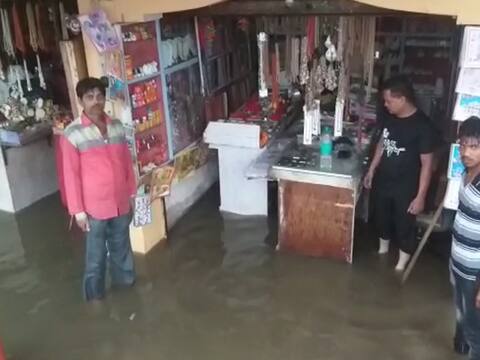 ભારે વરસાદને પગલે સોમનાથ મંદિર નજીક આવેલા શોપિંગ સેન્ટરની દુકાનોમાં ઢીચણ સમા પાણી ભરાઈ ગયા હતાં. ભરાયેલા પાણી ધીરે ધીરે ઉતરી રહ્યાં છે. આટલાં પાણીમાં પણ સોમનાથનાં લોકોએ મોટાભાગની દુકાનો રાબેતા પ્રમાણે ચાલુ રાખી છે.