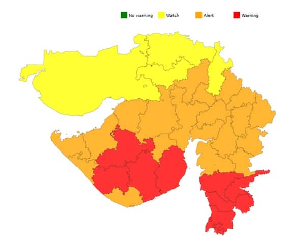 - રાજકોટ, અમરેલી, ભાવનગર, જૂનાગઢ, સુરત, ડાંગ, નવસારી, વલસાડ, તાપી, દમણ અને દાદરા નગર હવેલીમાં ભારે વરસાદની ખૂબ ઊંચી સંભાવના છે.