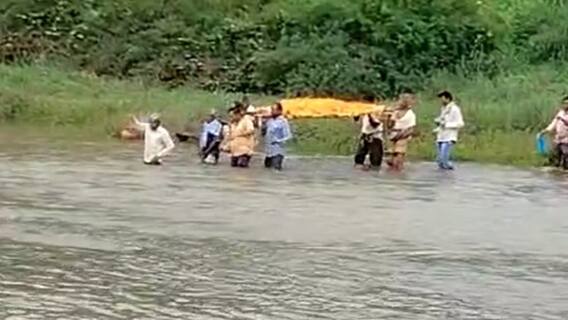 Latest Valsad News: દક્ષિણ ગુજરાતમાં ધોધમાર વરસાદ (heavy rain fall in south Gujarat) વરસ્યો છે. આ દરમિયાન વલસાડના (valsad) ધરમપુરના (dharampur) ભેંસધરા ગામનો (bhensdhara village) ચોંકાવનારો વીડિયો (video) સામે આવ્યો છે. ગામમાં એક વ્યક્તિના મોત બાદ નદીના ધસમસતા પ્રવાહમાં અંતિમ યાત્રા નીકળી (the final journey took place in the rush of the river) હતી. સ્મશાન સુધી પહોંચવા વચ્ચે નદી આવતી હોવાથી લોકો જીવના જોખમે નદીના પાણીમાં અંતિમ યાત્રા (last rites) કાઢી હતી. નદી પાર કરવા કોઝવે (cause way) કે પુલનો (bridge) અભાવ હોવાના કારણે લોકોએ (people) આવી રીતે જીવને જોખમમાં મૂકવો પડે (life has to be put in danger) છે. ચોમાસામાં સ્મશાન ભૂમિ સુધી પહોંચવા લોકો આવી જ રીતે અંતિમયાત્રા કાઢવા મજબૂર બને છે.