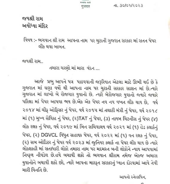 પત્રમાં તેમણે લખ્યું છે, જયશ્રી રામ તમારા ચરણોમાં વંદન.... આજે પ્રભુ આપને પત્ર પાઠવવાની જરૂરિયાત એટલા માટે ઉભી થઈ છે કે ગુજરાતમાં ઘણા વર્ષોથી આપના નામ પર ચુંટાતી સરકાર શાસનમાં છે. ગુજરાતમાં લાખો બેરોજગાર યુવાનો છે. જયારે જ્યારે પરીક્ષામાં પેપર આપવા જાય છે ત્યારે એક પેપર નવ નવ વખત લીક થાય છે. લોકશાહીમાં સત્તાધારી લોકો તમારા નામ પર મદમસ્ત બની લોકોને ન્યાય આપવામાં નિષ્ફળ નીવડ્યા છે. હવે બચાવી શકો તો ભગવાન શ્રી રામ તમેજ એક જ અમારા યુવાનોનો બચાવી શકો છે. ત્યારે આપના મારફત સરકારનું ધ્યાન દોરવામાં આવે તેવી મારી વિનંતી છે.
