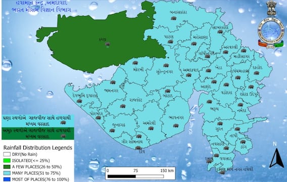 ગુજરાતના તમામ જિલ્લાઓમાં છૂટાછવાયા સ્થળોએ હળવાથી મધ્યમ વરસાદની આગાહી વ્યક્ત કરવામાં આવી છે. હવામાન વિભાગે રાજ્યના તમામ જિલ્લાઓમાં આજે વરસાદનું એલર્ટ આપ્યું છે.