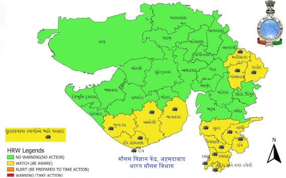 તો બીજી તરફ હવામાન વિભાગે પણ આજે વરસાદની આગાહી કરી છે. અરબી સમુદ્રમાં સર્જાયેલ સિસ્ટમના કારણે સૌરાષ્ટ્ર અને દક્ષિણ ગુજરાતના જિલ્લાઓમાં આજે ગાજવીજ સાથે ભારે વરસાદની હવામાન વિભાગે આગાહી જાહેર કરી છે. આઠ જિલ્લાના છુટાછવાયા સ્થળો ભારે વરસાદની શક્યતાને પગલે યલો એલર્ટ જાહેર કરવામાં આવ્યું છે.