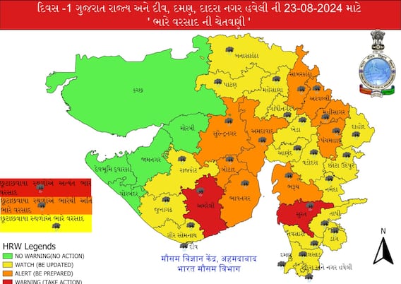 સૌરાષ્ટ્રમાં સુરેન્દ્રનગર, રાજકોટ, જૂનાગઢ, ભાવનગર, ગીર સોમનાથ, બોટાદ અને દીવમાં ભારેથી અતિભારે વરસાદની આગાહી કરવામાં આવી છે. અમદાવાદ જિલ્લામાં ભારેથી અતિભારે વરસાદની આગાહી હવામાન વિભાગે કરી છે.