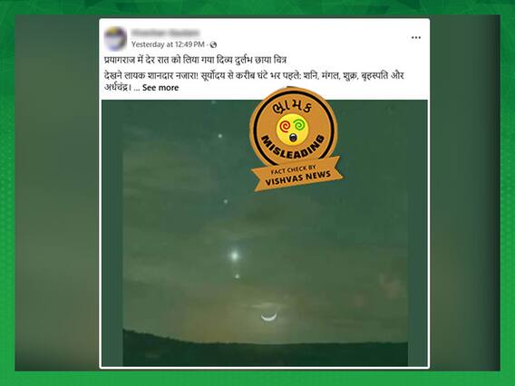 ફેસબુક યુઝર વિવેકન ગૌતમે 18 ફેબ્રુઆરીના રોજ એક વીડિયો અપલોડ કર્યો અને દાવો કર્યો, “પ્રયાગરાજમાં મોડી રાત્રે લેવાયેલી દૈવી દુર્લભ છાયાની છબી, જોવા માટે અદ્ભુત દૃશ્ય. સૂર્યોદય પહેલા લગભગ એક કલાક: શનિ, મંગળ, શુક્ર, ગુરુ અને અર્ધચંદ્રાકાર. આ દિવ્ય ગ્રહોને લાખો પ્રણામ. મહા કુંભ મેળો આ દુર્લભ ગ્રહોની પરેડ સાથે સંકળાયેલો છે. ૧૪૪ વર્ષમાં પહેલી વાર, ૨૯ જાન્યુઆરીના રોજ પુષ્ય નક્ષત્રમાં ગુરુ, શનિ, સૂર્ય અને ચંદ્ર એક જ રેખામાં એકસાથે લાઇનમાં જોવા મળ્યા. ભારતીય ખગોળશાસ્ત્ર અને જ્યોતિષશાસ્ત્રનું કેટલું અદ્ભુત ઉદાહરણ! ઓમ નમો ભગવતે નારાયણ ઓમ નમો નમઃ.”