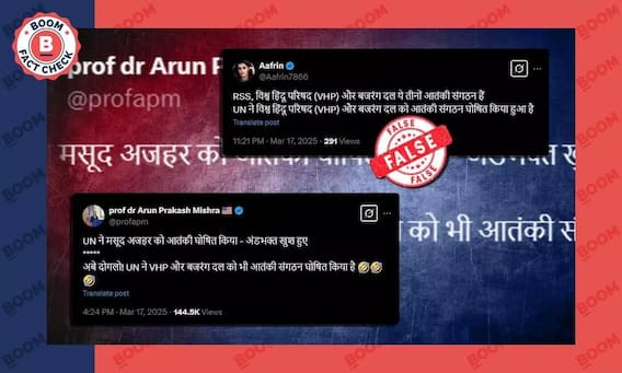 Fact Check: સોશિયલ મીડિયા પર એવો દાવો કરવામાં આવી રહ્યો છે કે સંયુક્ત રાષ્ટ્રએ ભારતીય દક્ષિણપંથી સંગઠનો વિશ્વ હિન્દુ પરિષદ અને બજરંગ દળને આતંકવાદી સંગઠનો જાહેર કર્યા છે. BOOM ને જાણવા મળ્યું કે UN એ ક્યારેય વિશ્વ હિન્દુ પરિષદ અને બજરંગ દળને આતંકવાદી સંગઠનો તરીકે સૂચિબદ્ધ કર્યા નથી. આ સંગઠનોના નામ યુએન સુરક્ષા પરિષદની આતંકવાદી સંગઠનોની યાદીમાં નથી. મે 2019 માં, યુએનએ જૈશ-એ-મોહમ્મદના વડા મસૂદ અઝહરને વૈશ્વિક આતંકવાદી જાહેર કર્યો. જોકે, યુએસ સેન્ટ્રલ ઇન્ટેલિજન્સ એજન્સી (CIA) એ 2018 માં તેની 'વર્લ્ડ ફેક્ટબુક' માં VHP અને બજરંગ દળને 'ધાર્મિક ઉગ્રવાદી સંગઠનો' તરીકે વર્ગીકૃત કર્યા હતા, જેને પાછળથી CIA ની યાદીમાંથી દૂર કરવામાં આવ્યા હતા.