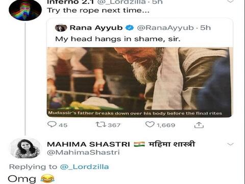 નવી દિલ્હી: લાલ બહાદુર શાસ્ત્રીની પૌત્રી મહિમા શાસ્ત્રી ટ્વિટર પર એક કોમેન્ટ કરવાને લઈને ટ્રોલ થઈ હતી. વાસ્તવમાં પત્રકાર રાણા અયુબે ટ્વિટર પર દિલ્હી હિંસાની ઘટનાને લઈ એક પોસ્ટ કરી હતી. જેમાં તેમણે મુદ્દસિરના પિતાની એક તસવીર શેર કરી હતી અને જેના પર લખ્યું હતું કે પોતાના પુત્રના અંતિમ સંસ્કાર પહેલા મુદ્દસિરના પિતા ભાંગી પડ્યા હતા અને આ તસવીર સાથે તેમણે લખ્યું હતું કે, સર, અમારુ માથું શરમથી ઝૂકી ગયું. મુદ્દસિરનું દિલ્હી હિંસામાં મોત થયું હતું. આ પોસ્ટ ને કોઈકે શેર કરી હતી જેના પર મહિમા શાસ્ત્રીએ રીટ્વિટ કરીને ‘OMG’ લખી એક સ્માઈલી ઈમોજી બનાવી હતી. જો કે મહિમા શાસ્ત્રીનું ટ્વિટર હેન્ડલ વેરિફાઈડ નથી. તેણે પોતાના ટ્વિટર એકાઉન્ટ પર આપેલા પરિચયમાં પોતાને લાલ બાહદુર શાસ્ત્રીની પૌત્રી ગણાવી છે. મહિમા શાસ્ત્રીની આ કોમેન્ટને લઈ તેને ટ્રોલ કરવામાં આવી રહી છે. એક યૂઝરે લખ્યું કે, 'લાલ બહાદુર શાસ્ત્રી પોતાની પૌત્રી મહિમા શાસ્ત્રી દ્વારા એક વૃદ્ધ વ્યક્તિના દુખનું મજાક ઉડાવતા જોઈને ગર્વ અનુભવતા હશે. ' અન્ય એક યુઝરે લખ્યું, આપ લાલબહાદુર શાસ્ત્રીની પૌત્રી છો. તમને શરમ આવવી જોઈએ.