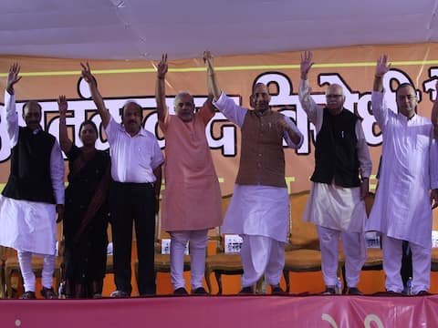 NEW DELHI, INDIA - SEPTEMBER 19, 2008: BJP's senior leaders LK Advani , Rajnath Singh, Arun Jaitely, Narendra Modi and others during anti terrorism rally at Karol Bagh, on September 19, 2008, in New Delhi, India. (Photo by Virendra Singh Gosain/Hindustan Times via Getty Images)