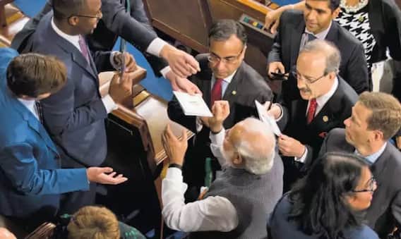 PM Modi US Visit: વડાપ્રધાન નરેન્દ્ર મોદીનો કરિશ્મા અમેરિકામાં પણ જોવા મળ્યો. તેમની લોકપ્રિયતાનો અંદાજ એ વાત પરથી લગાવી શકાય છે કે યુએસ કોંગ્રેસના સંયુક્ત સત્રને સંબોધિત કર્યા બાદ ત્યાંના સાંસદો પીએમ મોદીને મળવા આતુર હતા. તેમના ઓટોગ્રાફ લેવા માટે સાંસદોએ લાઈનો લગાવી હતી. આ દરમિયાન ઘણા લોકોએ તેમની સાથે સેલ્ફી પણ લીધી હતી. વડાપ્રધાન નરેન્દ્ર મોદીએ હાઉસ ઓફ રિપ્રેઝન્ટેટિવ્સના સ્પીકર કેવિન મેકકાર્થીની જોઈન્ટ સેશન એડ્રેસ બુક પર પણ હસ્તાક્ષર કર્યા હતા.