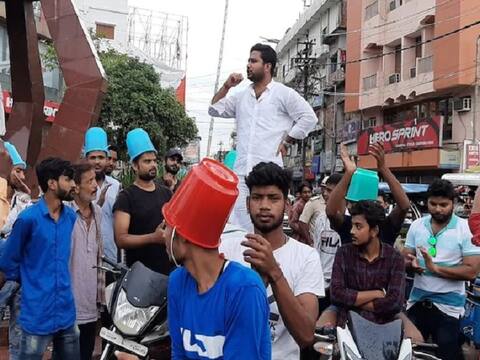 મોટર વ્હીકલ એક્ટ: RJDના કાર્યકર્તાઓએ માથે ડોલ પહેરીને કર્યો અનોખો વિરોધ