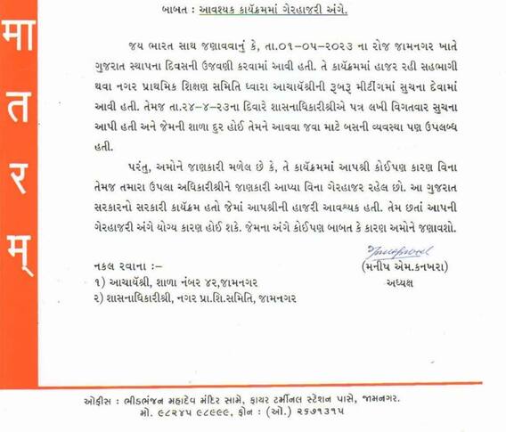62 આચાર્યો-શિક્ષકોને "મન કી બાત' સાંભળવાનો કાર્યક્રમ કેમ ન ગોઠવ્યો અને સરકારી કાર્યક્રમમાં હાજરી ના આપવા બાબતે ખુલાસો પૂછતા વિવાદના એંધાણ જોવા મળી રહ્યા છે. ચેરમેન સીધા જ આવી રીતે ખુલાસો ના પૂછી શકે તેને લઈને શિક્ષકોમાં આંતરિક ચર્ચાઓ છે.