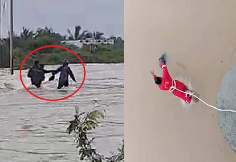 દ્વારકાઃ હડમતીયા ગામ પાસેની નદીમાં ધસમસતા પૂર વચ્ચેથી રસ્તો પસાર કરવો 3 લોકોને ભારે પડી ગયો છે. પાણીના પૂર વચ્ચે રસ્તો પસાર કરવા જતાં ત્રણેય વ્યક્તિ તણાઈ ગયા હતા. જેના લાઇવ દ્રશ્યો સામે આવ્યા છે. જેમાં જોઇ શકાય છે કે, તેમને પાણીનો પ્રવાહ કેવી રીતે તાણીને લઈ જાય છે. જેમાંથી એકને બચાવી લેવામાં આવ્યો છે. આ વ્યક્તિઓને બચાવવા માટે NDRFના જવાનોએ જીવની બાજી લગાવી દીધી હતી. આ રેસ્ક્યૂના પણ દીલધડક દ્રશ્યો સામે આવ્યા છે. મળતી વિગતો પ્રમાણે કંપનીમાં સિક્યુરિટી ગાર્ડ તરીકે ફરજ બજાવતા ત્રણ યુવકો નદીના પાણી બ્રિજ ઉપરથી પસાર થઈ રહ્યા હોવા છતાં રસ્તો પાર કરવાનું જોખમ લીધું હતું. જોકે, તેઓ રસ્તો પાર કરે તે પહેલા જ તેમને પાણીનો પ્રવાહ તાણી ગયો હતો. જોકે, એક સિક્યુરિટી ગાર્ડને બચાવી લેવામાં આવ્યો છે. જ્યારે 2ની શોધખોળ ચાલુ છે. ભારે પૂરના કારણે નદીમાં તણાયેલી 3 વ્યક્તિમાંથી એકને લોકોએ બચાવી લઈ બહાર કાઢી હતી. જ્યારે 2ની શોધખોળ તેજ કરાઈ છે. આ અંગે તંત્રને જાણ કરી ટીમોને બોલાવવામાં આવી છે. એનડીઆરએફના જવાનોએ આ સિક્યુરિટી ગાર્ડને બચાવવા માટે જીવ જોખમમાં મૂક્યું હતુ અને તેમને બચાવવાનો પ્રયાસ કર્યો હતો. આ રેસ્ક્યૂના દ્રશ્યો પણ સામે આવ્યા છે.