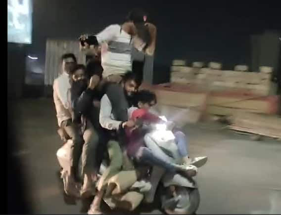 Rajkot News: રાજ્યમાં ફરી એકવાર સ્ટન્ટ વીડિયો વાયરલ થતાં તંત્ર સામે સવાલો ઉભા થયા છે. ગઇકાલે જાનૈયાઓ દ્વારા પંચમહાલમાં ચાલુ કારે સ્ટન્ટ કરવામાં આવી રહ્યો હોવાનો વીડિયો સામે આવ્યો હતો, હવે આજે રાજકોટમાંથી બાઇક સવારોનો જોખમી સ્ટન્ટ વીડિયો સામે આવ્યો છે, જેમાં એક જ બાઇક પર છ યુવાનો જોખમી સ્ટન્ટ સવારી કરતાં દેખાઇ રહ્યાં છે.