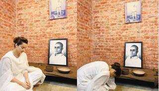 કંગના દ્વારા ઇન્સ્ટાગ્રામ પર શેર કરવામાં આવેલી તસવીરોમાં જોઇ શકાય છે કે, તે વીર સાવરકરની તસવીરોની આગળ માથુ નમાવીને બેસેલી છે. આ દરમિયાન કંગના ખુબ શાંત અને ભાવુક દેખાઇ રહી છે.