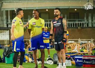 સરપ્રાઈઝ વિઝિટઃ બેંગ્લોરની ટીમનો પૂર્વ કેપ્ટન વિરાટ કોહલી પ્રેક્ટિસ દરમ્યાન ધોની અને બ્રાવો સાથે દેખાયો હતો.