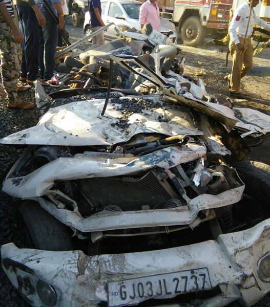 રાજકોટઃ ડમ્પરનું ટાયર ફાટતાં સર્જાયો અકસ્માત, કારનું વળી ગયું પડીકું, 2નાં મોત