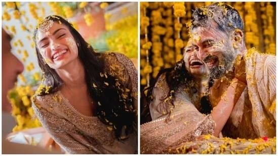 પ્રથમ તસવીરમાં આથિયા અને કેએલ રાહુલ એકબીજાને હલ્દી લગાવી રહ્યા છે. બંને સ્માઇલ કરી રહ્યા છે. તેમની ચારે બાજુ મેરીગોલ્ડ ફૂલની પાંખડીઓ જોવા મળી રહી છે. આગળના ફોટામાં અથિયાનો આઉટફિટ સંપૂર્ણપણે દેખાઈ રહ્યો છે. તેણે ગોલ્ડન વર્ક સાથે પીચ કલરનો અનારકલી સૂટ પહેર્યો છે. એક ફોટોમાં તે તેના ભાઈ અહાન શેટ્ટીના ચહેરા પર પણ હલ્દી લગાવી રહી છે. છેલ્લા ફોટામાં તે સૂર્યપ્રકાશને જોઈને પોઝ આપી રહી છે. તેણે કેપ્શનમાં લખ્યું – ખુશી. કેએલ રાહુલે સમારંભની કેટલીક ના દેખેલી તસવીરો પણ શેર કરી છે. એક તસવીરમાં તે હલ્દી લગાવી રહ્યો છે. એક ફોટામાં કપલ પ્રેમમાં ડૂબેલા જોવા મળે છે.
