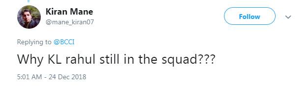 નવી દિલ્હીઃ સોમવારે ભારતીય ટીમ પસંદગીકારોએ ઓસ્ટ્રેલિયા અને ન્યૂઝીલેન્ડ માટે વનડે અને ટી20 સીરીઝ માટે ટીમ ઇન્ડિયાની જાહેરાત કરી છે. આમાં એક ખેલાડીના નામની જાહેરાતને લઇને સોશ્યલ મીડિયા પર ફેન્સ ભડકી ગયા છે. આ નામ બીજા કોઇનુ નહીં પણ ટેસ્ટમાં ઓપનર તરીકે ફેલ થઇ રહેલા લોકેશ રાહુલનું છે. લોકેશ રાહુલના સિલેક્શનને લઇને ફેન્સે સોશ્યલ મીડિયા પર ભડાશ કાઢી છે.