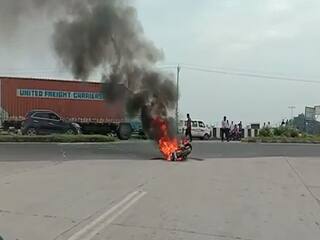 હાલોલ-કંજરી બાયપાસ પર અચાનક લાગી બાઈકમાં આગ, જુઓ વીડિયો