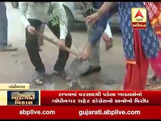 ગાંધીનગરમાં કૉંગ્રેસે રસ્તા પરના ખાડાઓમાં વૃક્ષા રોપણ કરીને કર્યો વિરોધ, જુઓ વીડિયો